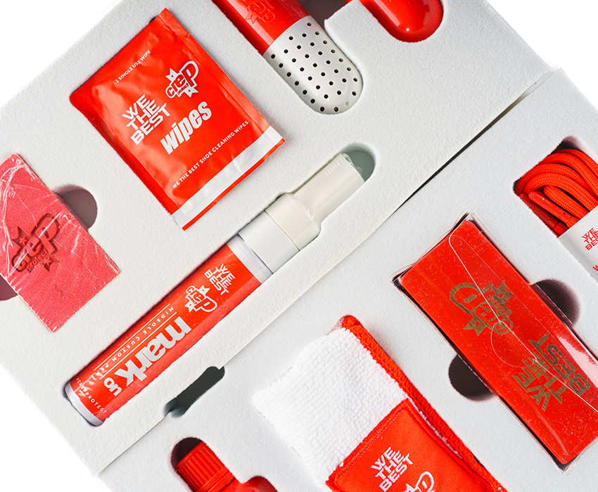 TUBE PACKには防水スプレー、シューケアキット、ペーパークリーナー、シューフレッシュナー、シューキーパーが入っています。スニーカーのケアに欠かせないツールがこれひとつで揃う贅沢なセットです。